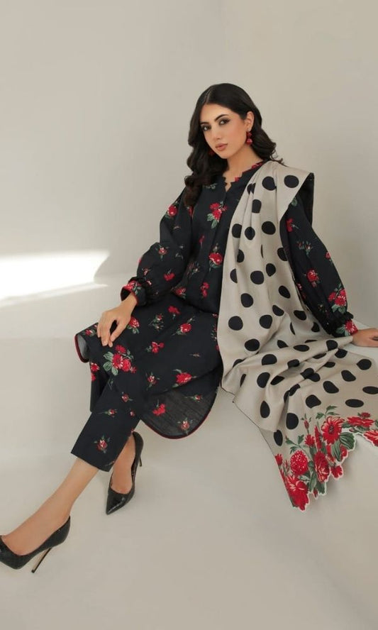 Dhanak 3pc unstitched embroidered shirt with printed wool shawl