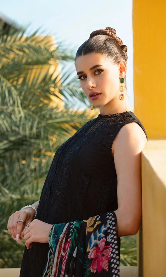 Lawn 3pc unstitched chiken kari embroidered suit with poly lawn digital printed dupatta
