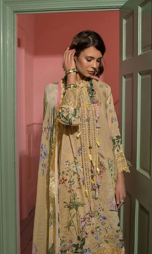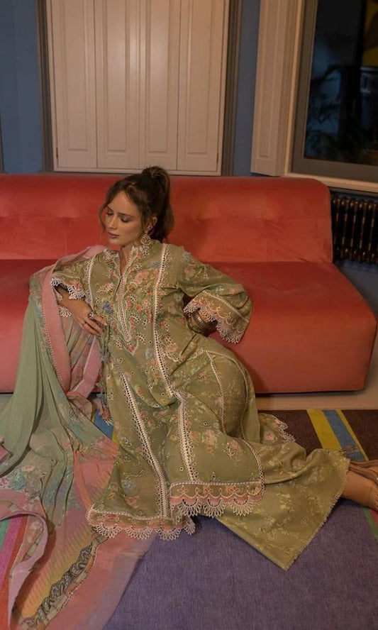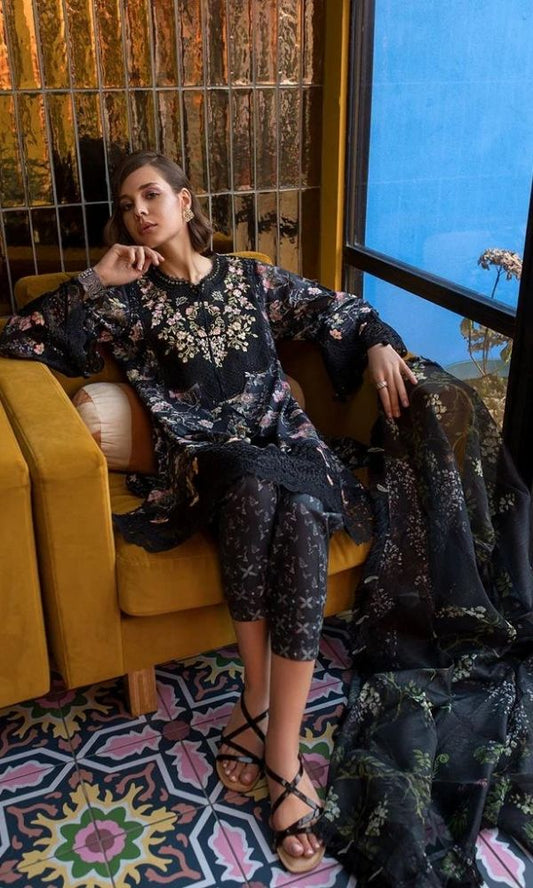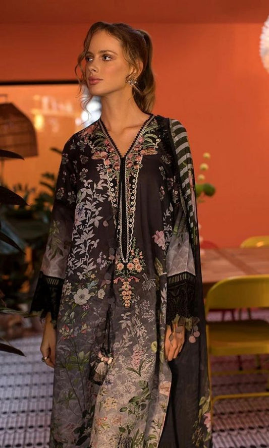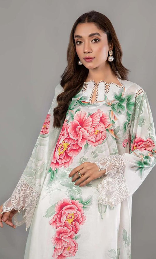 Lawn 3pc heavy embroidery suit with silk printed dupatta and embroidered trouser