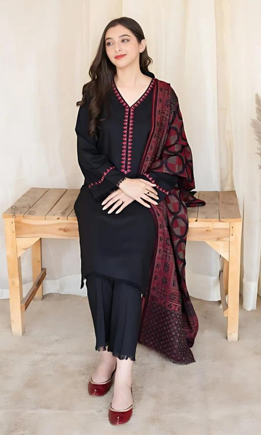 Dhanak 3pc unstitched fully embroidered suit with digital printed wool shawl